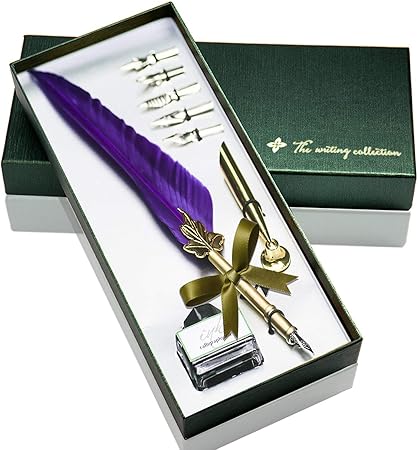 Amazon Com Feather Pen Glodeals Antique Calligraphy Pen Handcrafted Feather Quill Pen Set Writing Quill Dip Pen With 5 Replacement Nibs Pen Nib Base Dip Ink Bottle In Gift Storage Box Purple